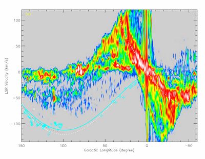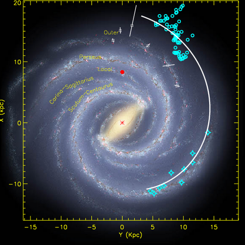 Fig. 1 An artist’s conception of the Milky Way (R. Hurt: NASA/JPL-Caltech/SSC). The blue filled stars and circles mark clouds covering Galactic longitudes from l=13d to 55d detected by Dame & Thaddeus (2011), and l=100d to 150d detected by us, respectively. The white squares indicate the locations o high mass star forming regions associated with the Outer arm. The white solid line is a log spiral which traced the fitting results to all available data including clouds detected by Dame & Thaddeus (2011). (Image by Su Yang)