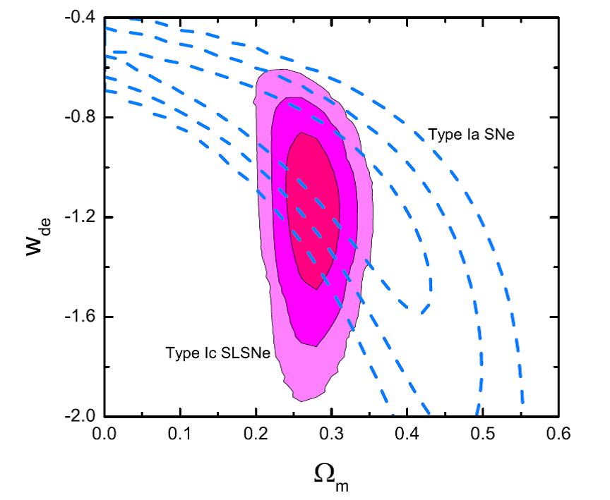 Fig. 1 1σ, 2σ, and 3σ confidence regions for the wCDM model using simulated SLSNe Ic (shaded, with red contours), compared with those (dashed blue contours) associated with the 580 Union2.1 Type Ia SNe.