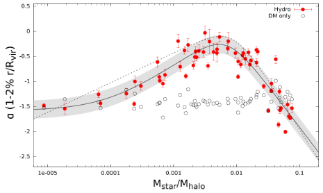 Fig.2. The inner slope of galaxies as a function of star formation efficiency. Compared to results from pure dark matter simulation (empty circles), the inner slope in hydro-dynamical simulation depends on the star formation. Maximum expansion is reached at intermediate star formation efficiency.