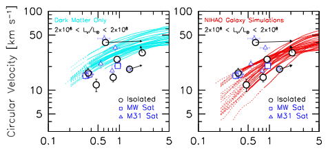 Fig.3 The circular velocity profiles of NIHAO galaxies. Left: velocity profile from pure dark matter simulation. It is seen most NIHAO galaxies (blue lines) have circular velocity larger than the data (empty circles) at given radius. Right: the correspondence in hydro-dynamical simulation. The circular velocity is decreased due to baryonic feedback, leading to better agreement with the data. Our results solve the Too-big-to-Fail problem.