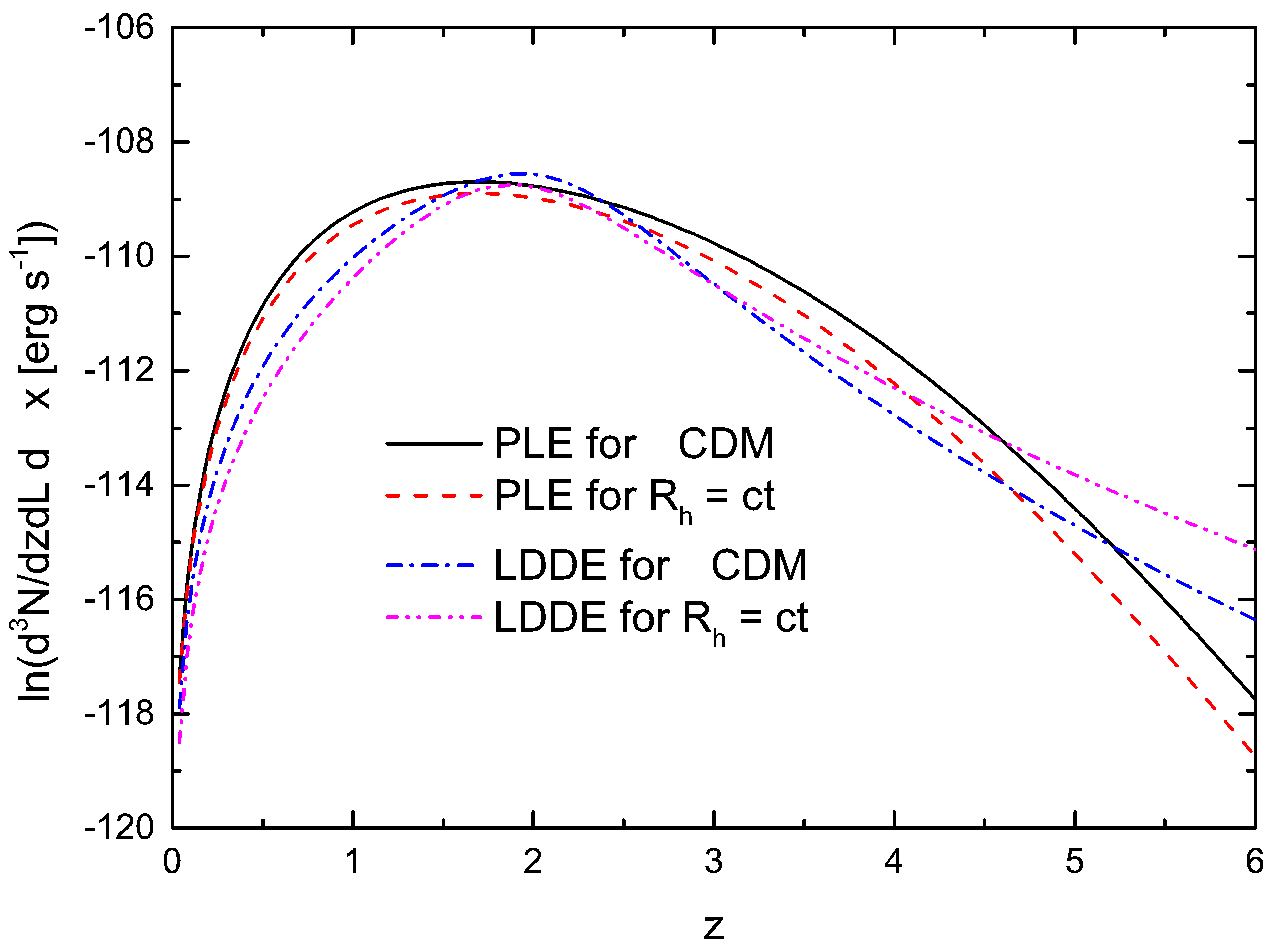 Fig. 1 Space density of gamma-ray emitting FSRQs as a function of redshift z for the concordance∧CDM and Rh= ct cosmologies, using two formulations of the GLF: pure luminosity evolution and luminosity-dependent density evolution. This illustration corresponds to two fixed parameters: Lγ = 1.0 × 1048 erg s-1 and Γ=2.44. (Image by ZENG Houdun)