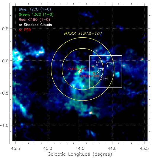 Fig. 1 12CO (J=1–0, blue),13CO (J=1–0, green), and C18O (J=1–0, red) intensity map toward HESS J1912+101 in the 58.5–62.0 kms?1 interval. The two yellow circles indicate the outer and inner TeV shells of HESS J1912+101 (Aharonian et al.2008a; Gottschall et al.2016), while the red and the white circles indicate the two pulsars(Morris et al.2002; Hobbs et al.2004)and the shocked clouds. The white box indicates the region shown in Figure2. (Image by SU Yang)